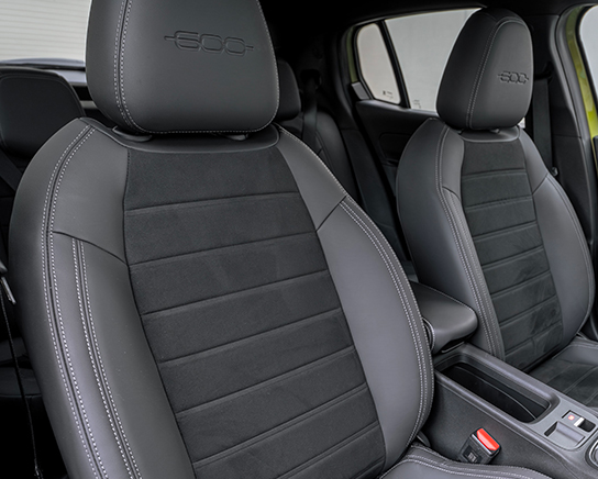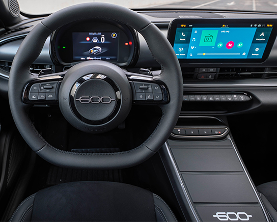 Wsiądź do nowego Fiata 600 Sport i odkryj czarne wnętrze, które na nowo definiuje nowoczesną elegancję. Nowe wykończenie deski rozdzielczej, sportowe fotele i eleganckie czarne panele drzwi tworzą atmosferę, w której komfort łączy się z charakterem. Stylowe wyposażenie, które Cię otacza, pozwala odczuć czystą energię Fiata 600 w każdym jego detalu.